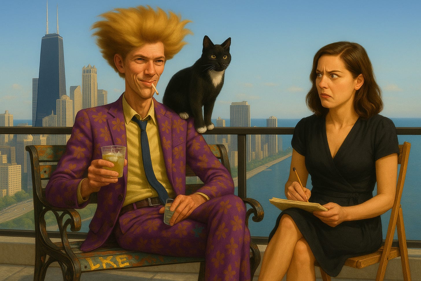Full lips, upturned as he speaks, make him look like he’s his own ventriloquist dummy, the unseen puppet master fisting him deep to everyone’s satisfaction, except those forced to hear him speak.